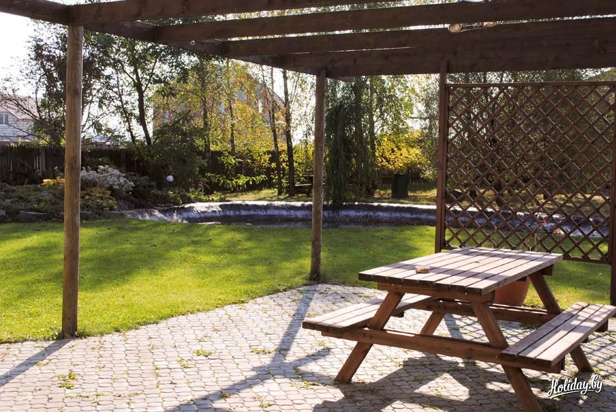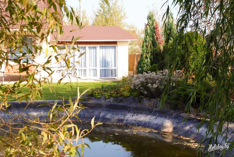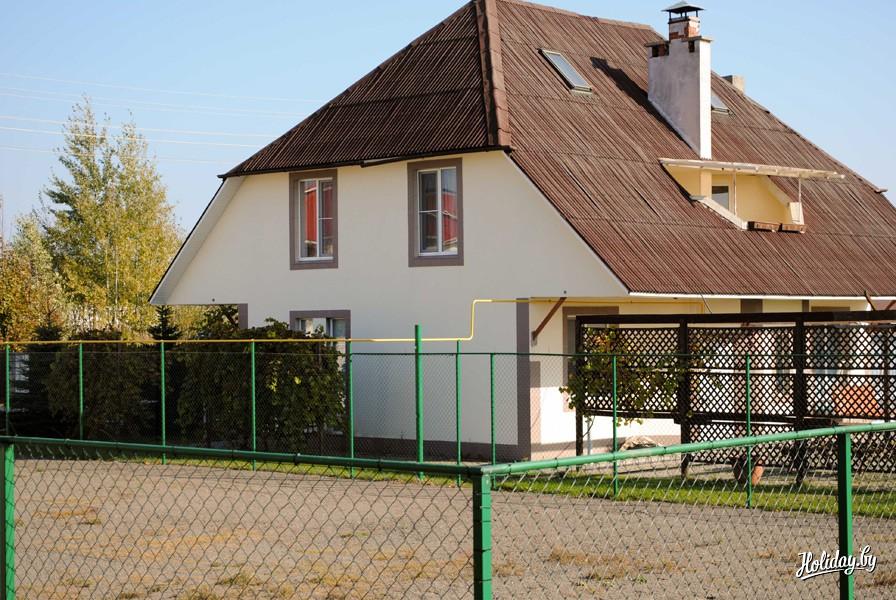 На всей прилегающей территории гостевого домика ухоженный зеленый газон. К услугам наших гостей альпийская горка, переходящая в плавательный пруд. Рядом березовая роща. Обустроена терраса с мангалом. Для активных посетителей есть теннисный корт, спортивная площадка, баскетбольное кольцо.
