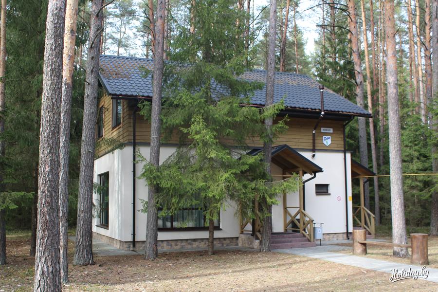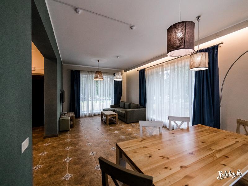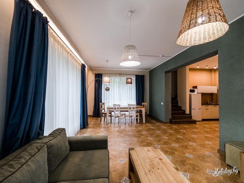 Для проживания мы предлагаем разместиться в двухэтажном гостевом доме, который вмещает компанию до 8 человек. Современный дом в аренду выполнен в эко-стиле. Коттедж на сутки обладает шестью основными спальными местами и двумя дополнительными. На первом этаже находится просторная гостиная с зоной отдыха и обеденным уголком. Здесь имеется телевизор, холодильник, микроволновая печь, электрочайник, набор для чая и кофе. На втором этаже находятся три спальные комнаты с красивым видом на сосновый лес. На каждом этаже есть санузел. Ванная комната оснащена набором личных гигиенических средств и феном. В доме работает Wi-Fi. В стоимость проживания входит завтрак. Пообедать и поужинать можно в ресторане, который находится на территории комплекса. В день заезда выделяется 0,5 л питьевой воды на человека. Курортный сбор в размере 3% оплачивается при заселении.