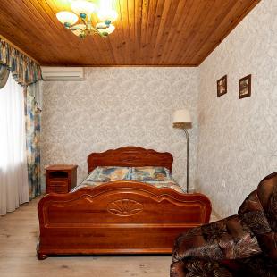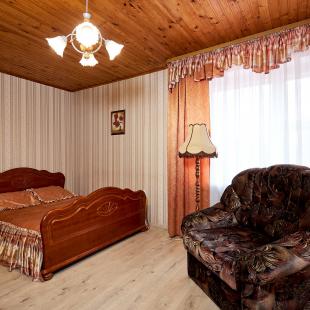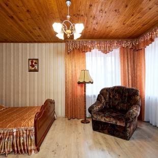 Малый дом базы отдыха подойдет для проживания до 14 гостей. В двухуровневом домике имеются двуспальные и односпальные кровати, санузлы на каждом этаже.