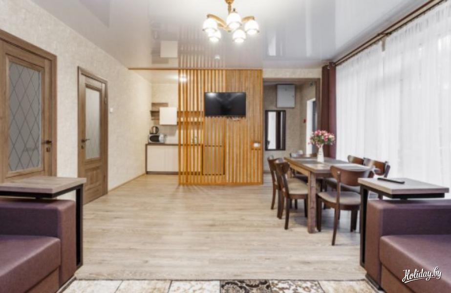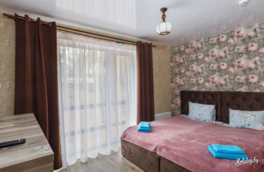 Апартаменты №2 в коттедже на сутки «Миссури» под Гомелем предназначены для компании из 4-х человек. В апартаментах есть две спальные комнаты с панорамными окнами, общая гостиная с обеденной зоной и двумя мягкими диванами, мини-бар, санузел с душевой и набором полотенец, выход на террасу. При необходимости можно оборудовать еще одно спальное место. Апартаменты оснащены телевизором, холодильником, чайником, микроволновкой, феном, работает интернет.