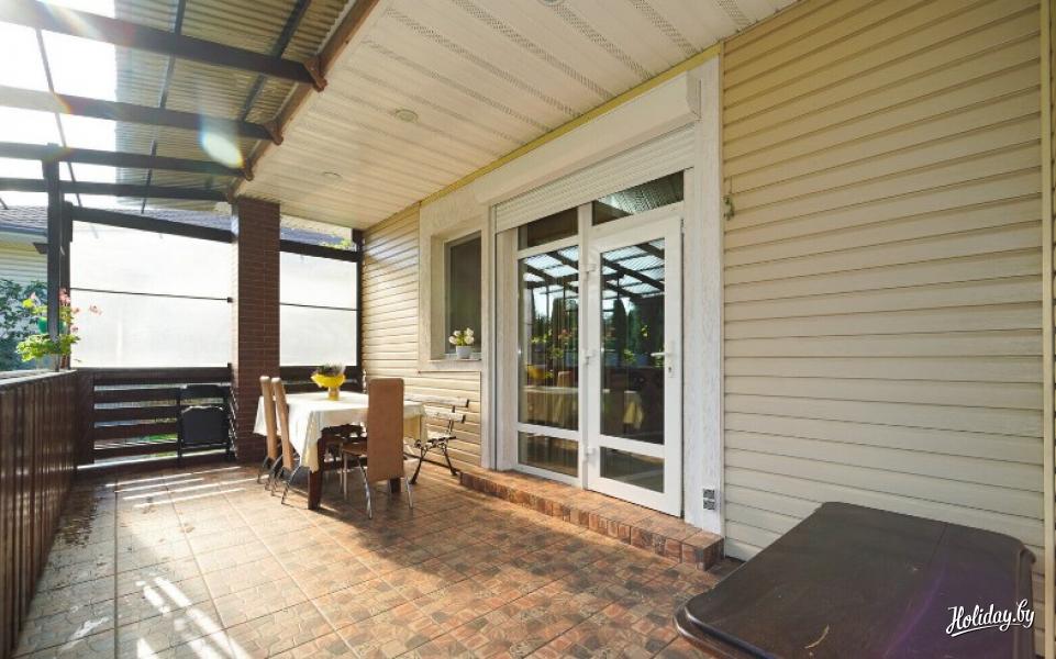 Просторный одноуровневый коттедж расположен в черте Минска. Вместимость дома - до 10 человек. Здесь имеется 5 комнат, оборудованная кухня, уютная терраса, каминный зал, два санузла, прачечная, а также сауна с джакузи и душевой. В каминном зале возможно проведения мероприятий до 50 человек.