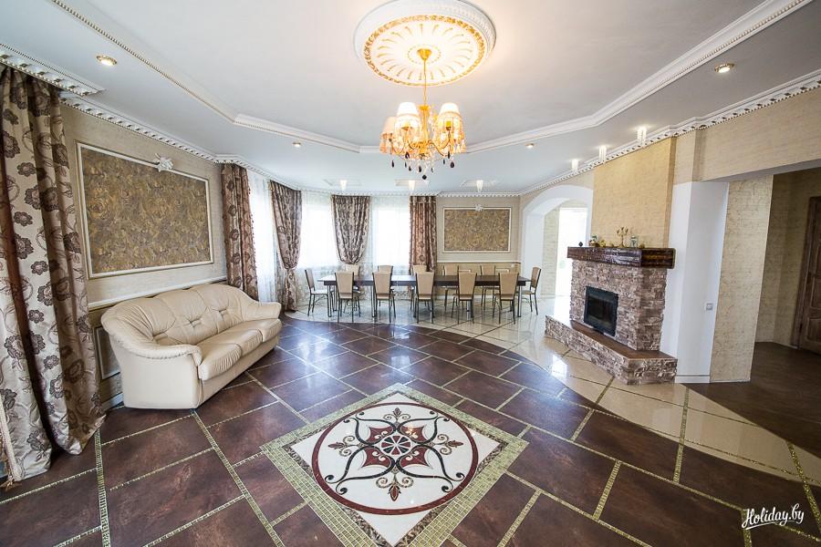 Коттедж в Минске рассчитан на 14 спальных мест. Всего в доме могут отдохнуть до 25 человек. Здесь есть 3 спальни со встроенными шкафами, гостиная с плазменной панелью, караоке, танцпол, банкетный зал. В доме есть душевая кабина, угловая ванна, 2 санузла. Полы на первом этаже и в санузлах с подогревом. Кроме того на первом этаже коттеджа располагается русская баня на дровах с душевой и обливным ведром.