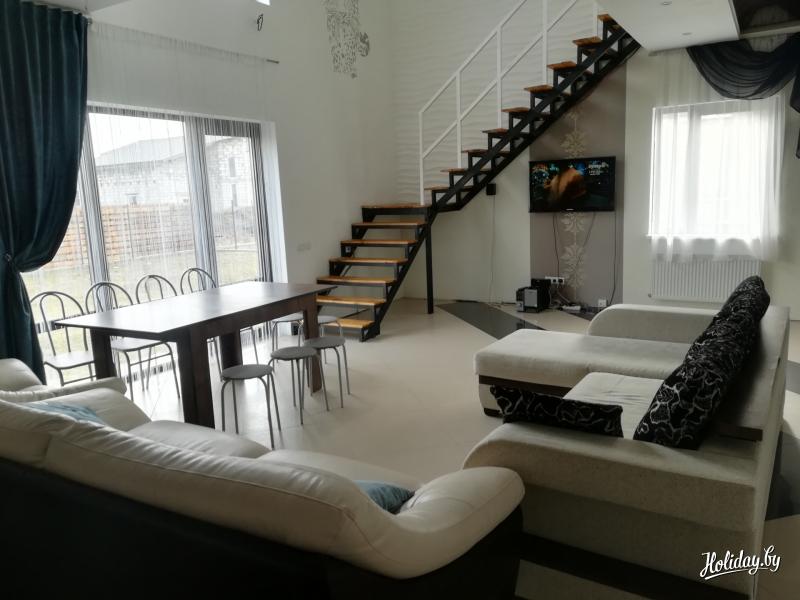 Коттедж в современном стиле в черте Гомеля. В двухуровневом доме имеется 10 спальных мест, большая гостиная с ТВ и спутниковыми каналами, санузел, интернет. Также здесь есть оборудованная кухня с варочной панелью, духовым шкафом, СВЧ, холодильником. Дом оборудован теплыми полами. В коттедже есть баня-бочка.