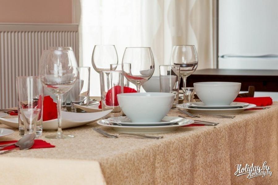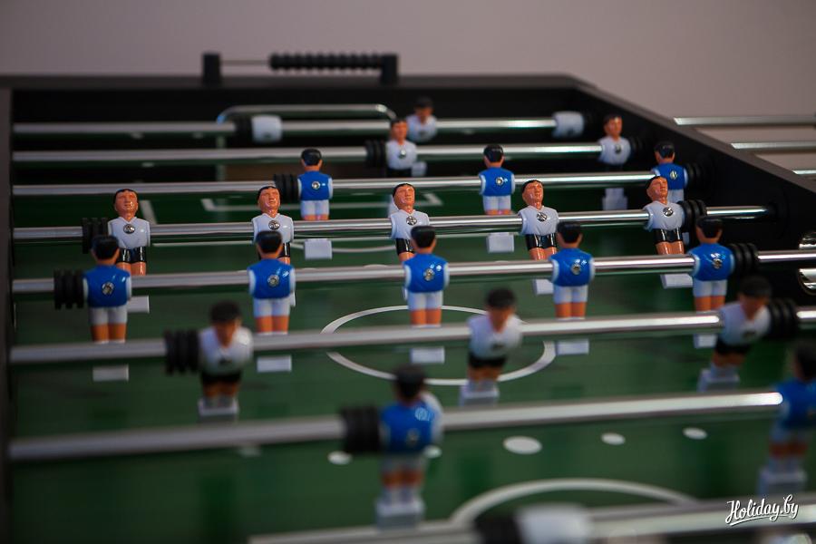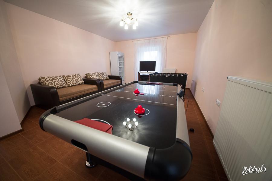 Кроме чудной природы, к вашим услугам дом, где могут разместиться до 50 гостей в банкетном зале. Остаться с ночевкой или арендовать коттедж под Минском на несколько суток могут до 20 человек в соответствии с количеством спальных мест в доме. Здесь есть зал-кухня, банкетный зал с камином. Коттедж — новый, построен в 2015 году, оформлен в современном стиле с использованием необычных элементов декора. В доме есть все необходимое, чтобы отдых был максимально комфортным: санузлы с душевыми кабинами на каждом этаже, функциональная кухня с двумя большими вместительными холодильниками, Wi-Fi, караоке, большой ЖКИ телевизор, музыкальный центр, электрическая духовка, газовая плита, электрочайник, стиральная машина. У нас вы можете насладиться игрой в аэрохоккей и Кикер (настольный футбол)