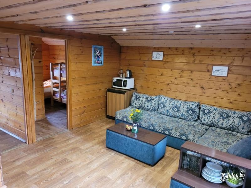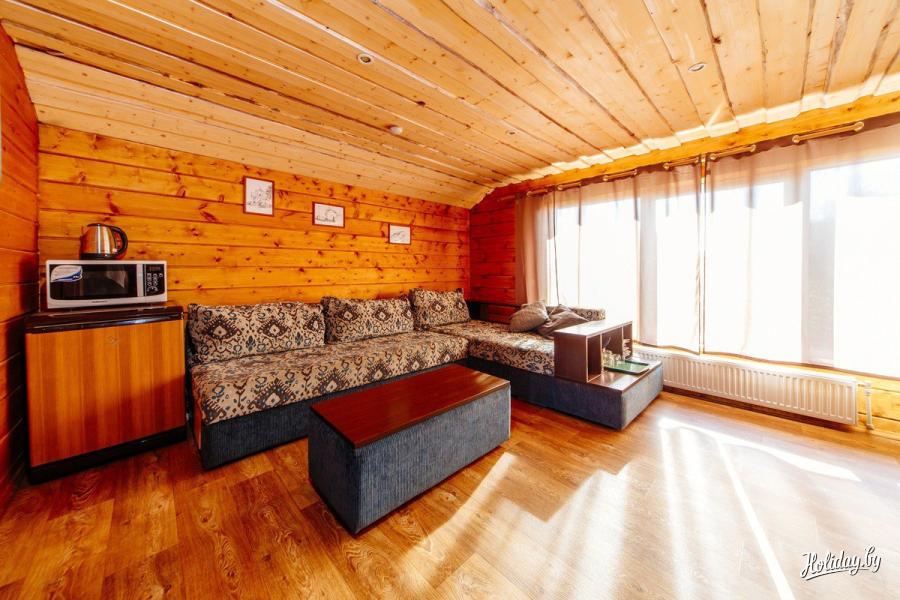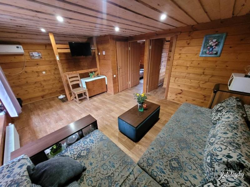 Номер Панорама состоит из двух отдельных комнат для отдыха и просторной гостиной с большим панорамным окном, красивый вид из которого порадует наших гостей. В гостиной расположен большой удобный угловой диван, ЖК-телевизор, журнальный столик, стол-книга. Также в гостиной установлен кондиционер, который обеспечит комфортный отдых в летние жаркие дни. В одной из спален имеется двухспальная кровать, во второй спальне - полуторная кровать и двухярусная полноразмерная кровать. Отделка всех комнат - натуральное дерево. Номер оборудован санузлом с душевой кабиной, водоснабжением, отоплением.
