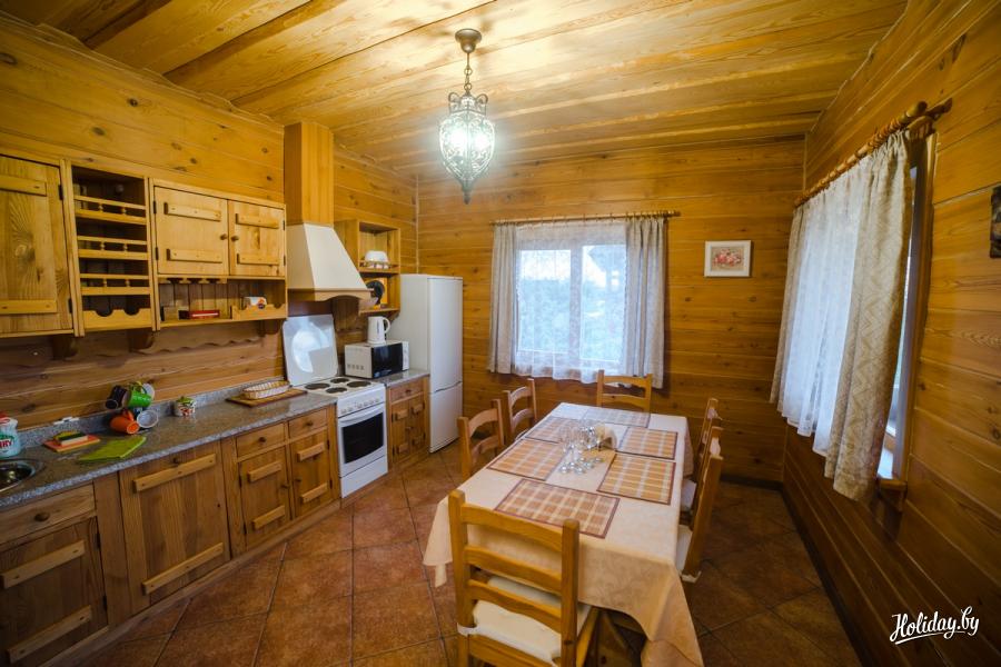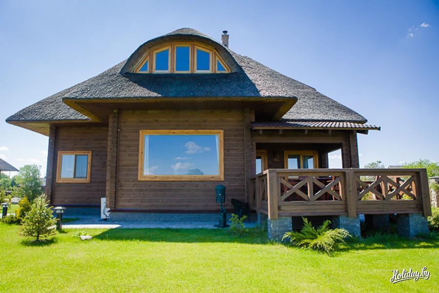 Коттедж на Браславских озерах «Соколиная охота» из цельного бруса, крыт тростником. В дополнении к системе кондиционирования это создает особый микроклимат, полезный для здоровья. Мебель в доме из массива дерева, вода – из собственной артезианской скважины.