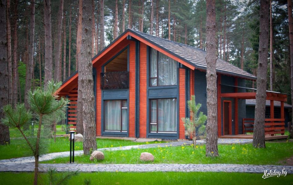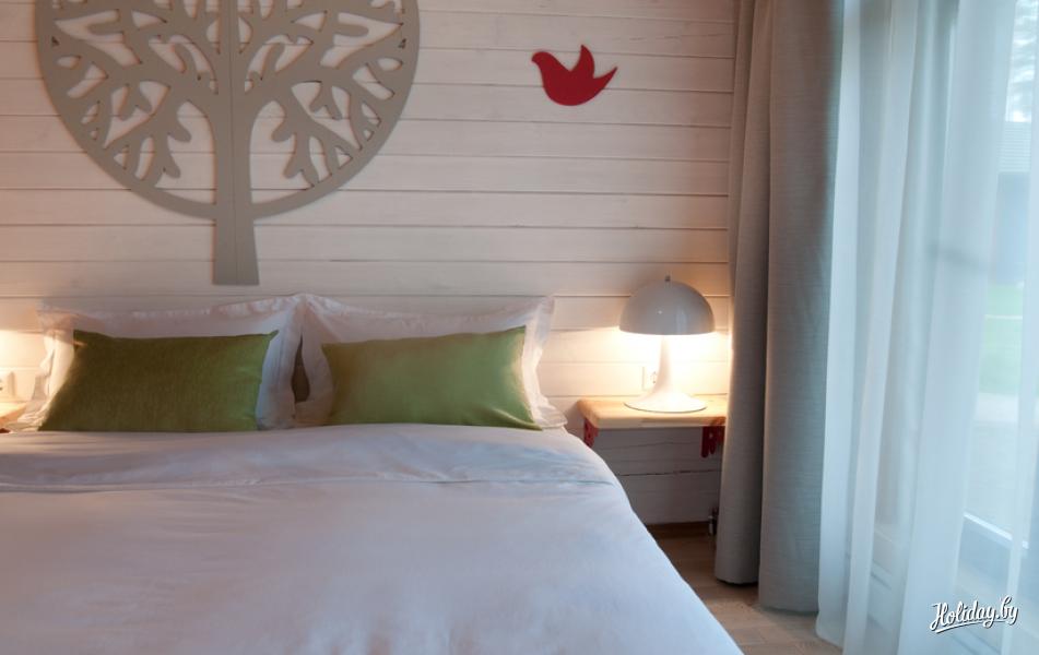 Номер находится на первом этаже домика, построенного из соснового бруса. Благодаря индивидуальному дизайну в нем уютно и приятно пахнет деревом. Одна из стен полностью стеклянная, что позволяет любоваться красотой леса и озера лежа в кровати.