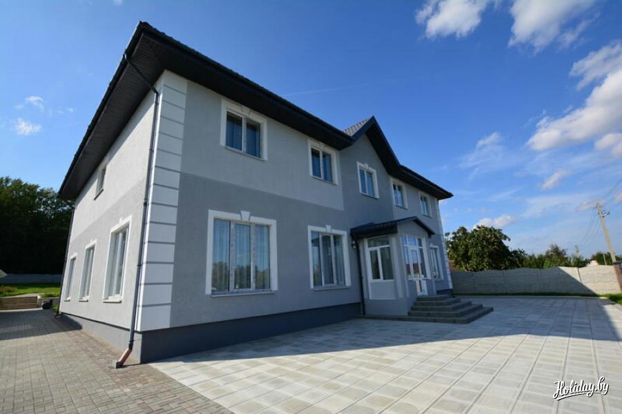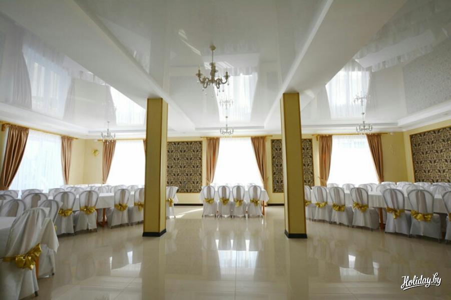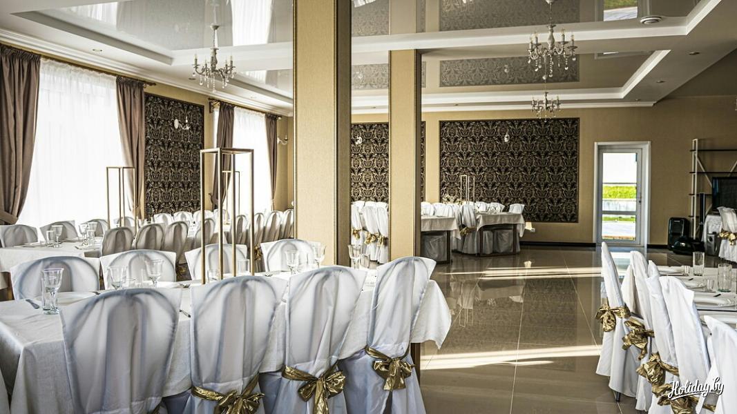 Оригинальный интерьер дома продуман до каждой мелочи – от наслаждения приятным отдыхом до разного рода развлечений и танцев. Шикарная позолоченная лестница в просторном холле приведет любого гостя в восторг, а для молодоженов послужит красивым декором для свадебной фотосессии. Первый этаж коттеджа полностью отведен под банкетный зал до 120 человек. Он оформлен в классическом стиле. К услугам гостей два санузла и кухня с холодильником, плитой, духовым шкафом, микроволновой печью и чайником. Отдохнуть после шумного мероприятия можно на втором этаже, где расположены восемь номеров и десять комнат, в каждом номере есть санузел, душевая кабина и умывальник.