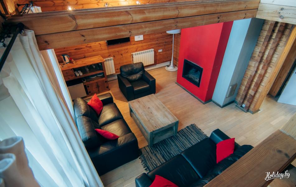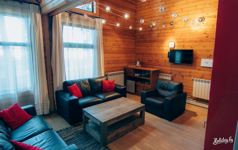 В домике 2 спальни с двуспальными кроватями, на первом и втором этажах. А так же гостиная с камином и верхним светом. Для удобства гостей предусмотрены две душевых комнаты, фен, телевизор на стене, холодильник для вина. Плотные шторы обеспечивают комфортный полноценный сон, а теплый свет ламп создает уют в вечернее время.