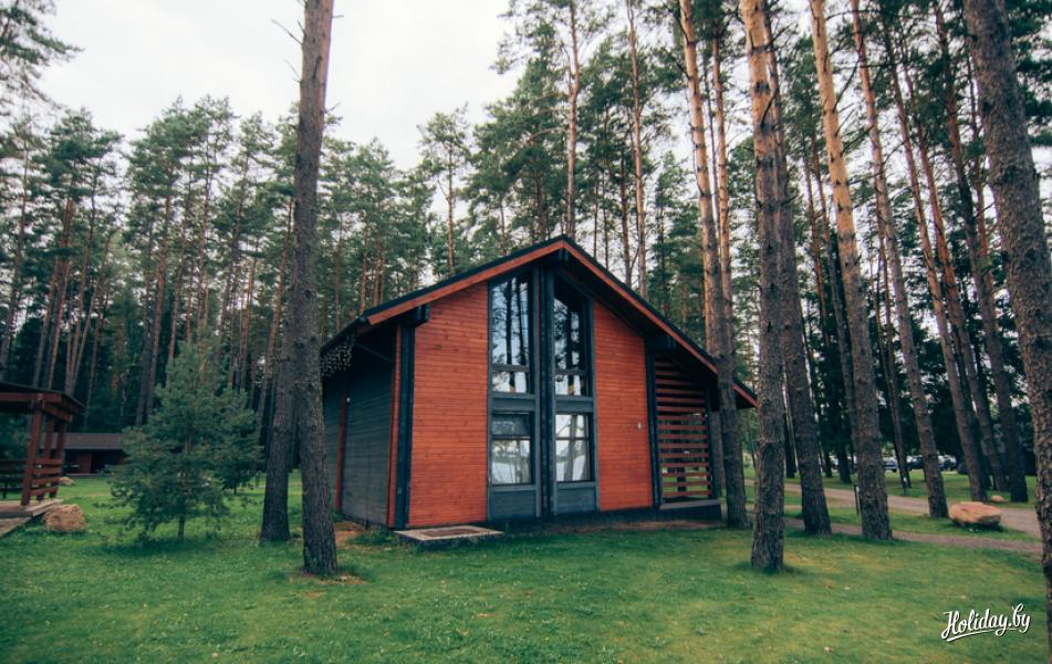 Домик VIP построен в эко-стиле, в нем приятно пахнет деревом, а окна в пол позволяют любоваться прекрасными видами на лес и озеро отовсюду.