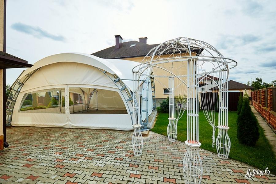 Шатер - идеальный выбор для создания сказочной, воздушной атмосферы свадебного дня! Романтики предпочитают вырваться из четырех стен и отпраздновать этот счастливый день в белоснежном, романтичном шатре. Свадьба в шатре- один из самых красивых вариантов свадьбы! Мы сможем разместить в своем шатре до 52 человек. Наши преимущества заключаются в том, что в шаговой доступности от шатра расположен дом, где могут разместиться на ночлег до 20 гостей. Аренда коттеджа в Минске включает не только проживание в комфортном доме, оборудованном кожаной мебелью, уютной гостиной и бильярдной комнатой. В нем вы сможете весело и интересно провести время. Территория коттеджа содержит элементы ландшафтного дизайна, здесь есть беседка и мангал, где летними вечерами особенно приятно проводить время в кругу семьи и друзей.