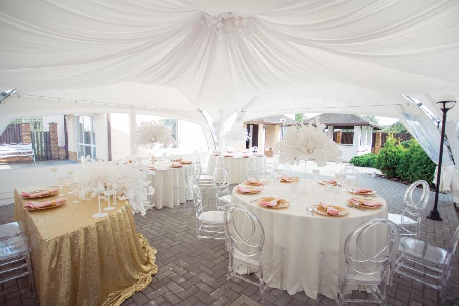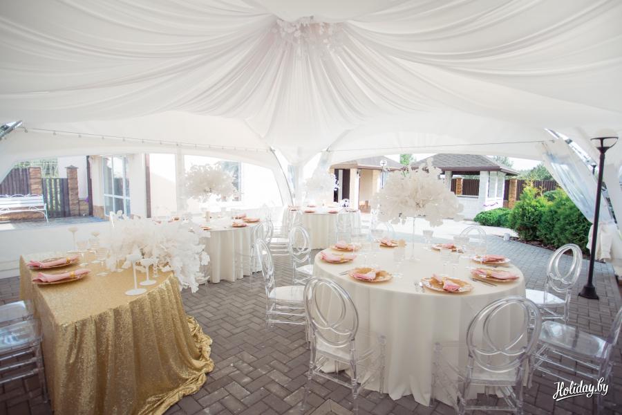 Особое событие жизни можно организовать в светлом банкетном зале в Минске на 30 человек. А наш новый шатер с апреля по ноябрь расположит до 50 человек. Прокат качественной французской посуды марки Luminarc, а также праздничное оформление помещения для свадьбы (резная ширма,зона молодых, скатерти, юбки на столы, чехлы на стулья , банты на стулья, подсвечники, свечи, искусственные букеты, стол для дарения, фуршетный стол).