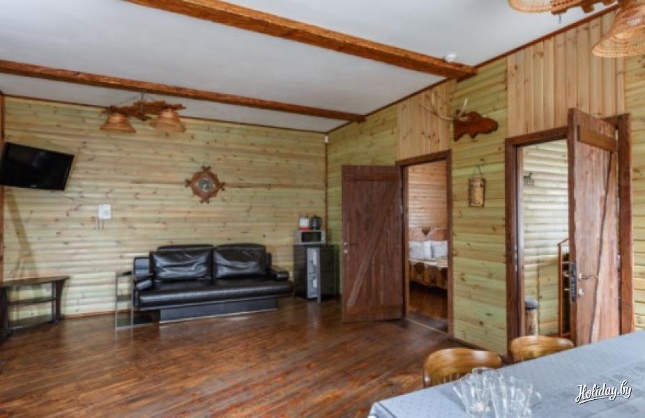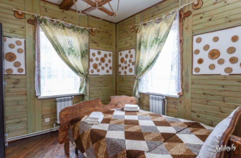 Коттедж на сутки «Аляска» в загородном комплексе «Ранчо» в 20 км от Гомеля вместит семью до 4 человек. Интерьер в доме выполнен из эко-материалов, комнаты обставлены деревянной мебелью, что придает помещениям уюта и тепла. Дом в аренду имеет 2 спальные комнаты с деревянными двуспальными кроватями, просторную гостиную с обеденной зоной на 4-х персон, санузел с душевой и полотенцами. Есть возможность оборудовать доп.спальное место. В гостиной установлен мягкий диван и камин. Из бытовой техники в доме есть телевизор, холодильник, фен, чайник, микроволновка.