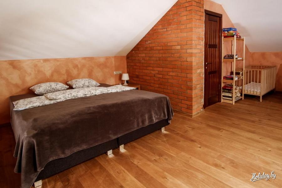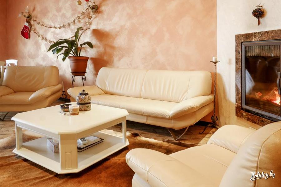 В коттедже имеется мини-кухня, гостиная с камином, санузел, сауна с душевой. На втором этаже расположены спальные места.