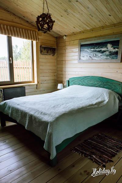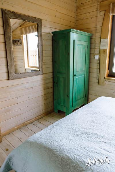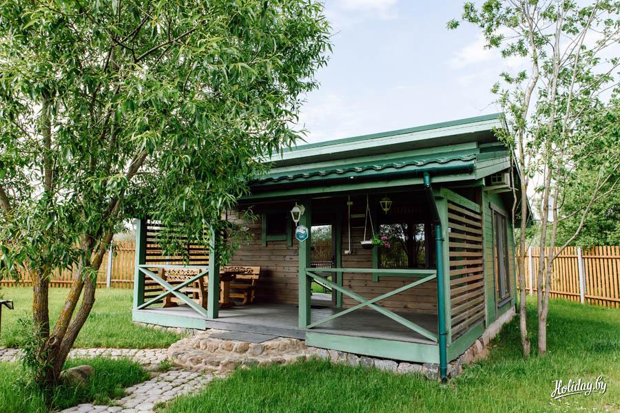 Деревянный дом из бруса с камином в «Здоровей». В доме «Бриз» находится спальня, совмещенная с гостиной и обеденной зоной, мебель ручной работы, камин и диван, крытая терраса с зоной барбекю. «Бриз» оборудован всей необходимой техникой (кондиционер, телевизор), а кухня представлена посудой, есть холодильник, чайник и микроволновая печь.