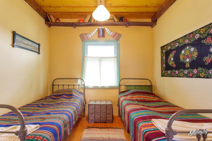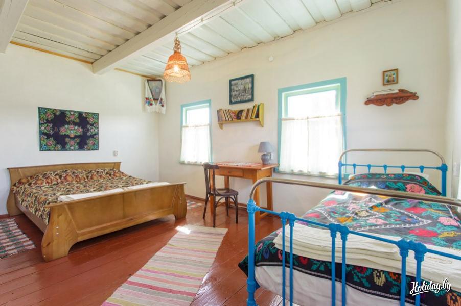 Дом №15 в туристической деревне под Гродно «Белые луга» создан в духе довоенной деревни. Он из дерева, на высоком фундаменте, на стенах — никаких обоев или краски, только побелка. Спать вы будете на деревянных кроватях, в качестве деталей и украшений дома – занавески с вышивкой, интересные старинные предметы быта. С террасы дома открывается замечательный вид на молодой сад.