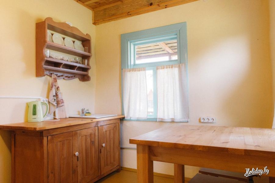 Дом №2 ― расположен на краю деревни и имеет особый колорит. Деревянные полы, оштукатуренные стены ― настоящая белорусская хата. Тем не менее в доме есть все, что необходимо современному человеку для комфортной жизни. Здесь есть душевая кабина, горячая вода, санузел, чайник, посуда, полотенца, постельное белье. В усадьбе под Гродно смогут расположиться до 4 человек, здесь есть одна двуспальная и две односпальные кровати.