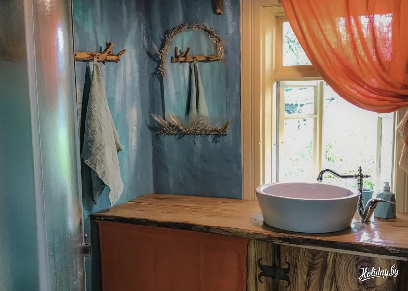 В усадебном доме имеются все удобства, при этом сохранен деревенский колорит. В усадьбе есть оборудованная кухня, ванная с душевой, несколько спален, открытая терраса.