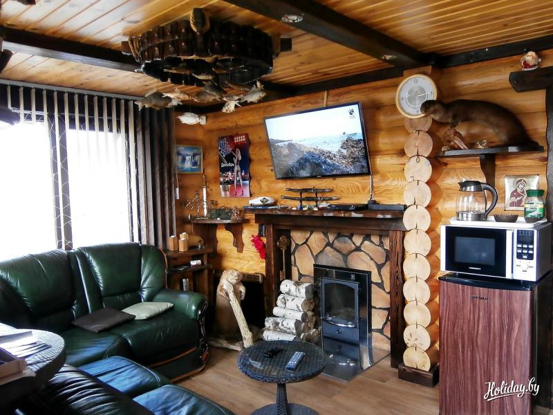 Гостевой домик-банька из оцилиндрованного деревянного бруса. В нем имеется: диван-кровать, шкаф-купе, табуретки, стол, фен, стиральная машина, сушилка для белья. Здесь есть печь-камин, кухня с посудой и столовыми приборами, фильтр очистки воды, холодильник, микроволновая печь, электроплитка, электрочайник, самовар, телевизор с плоским экраном (спутниковое триколор + эфирное), а также парная и душевая комната с двумя тропическими душами и уже включенными в стоимость аренды туалетными принадлежностям.