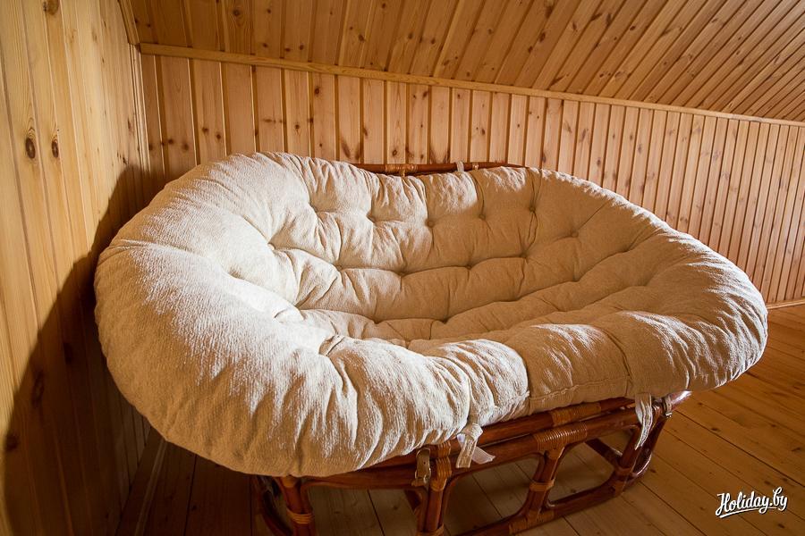 Дом Лисички предназначен для двоих, но есть возможность обустроить еще одно спальное место. Домик двухэтажный, на первом этаже – зона отдыха с диваном, столом, телевизором, Wi-Fi, санузлом. Второй этаж – мансардный, здесь расположена уютная спальня.