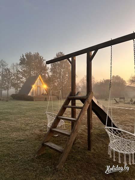 Изюминка Деревенского стильного домика A-Frame Маёнтак:-русская баня на дровах с кухней, террасой, зоной барбекю, комнатой отдыха и душевой. -чан на дровах под открытым небом -зона барбекю -домик-гриль, закрытая беседка на 10-16 человек -квадроциклы (экипировка)-детская площадка с качелями, горкой,где малыши могут играть, пока взрослые наслаждаются покоем.-вековой лес в 50 м