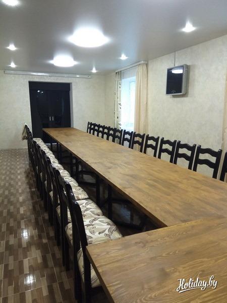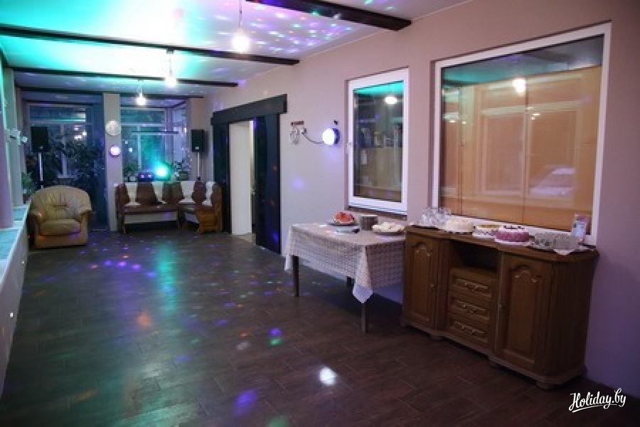 На первом этаже усадьбы находится красивый банкетный зал с кондиционером, FullHD-проектором и огромным трёхметровым экраном. За широкими дубовыми столами смогут разместиться до 40 чел. Из банкетного зала есть выход на застеклённую террасу, оборудованную всем необходимым для дискотеки (звук, свет, лазеры, дым, по заказу электропианино Roland XP-80) Радушные хозяева могут помочь с организацией проведения праздника (профессиональные повара, ведущий, Dj, фото, видеосъёмка,). Есть человек свободно владеющий разговорным английским. На втором этаже 15 гостей смогут остаться на отдых и ночлег. Для самых маленьких (до 3-х лет) есть три кроватки с постельными принадлежностями.