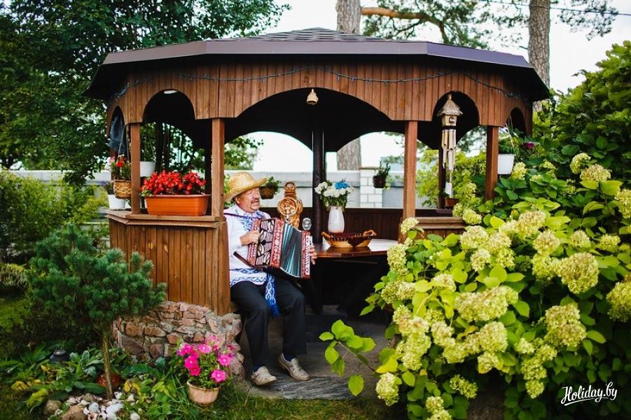 Летом праздники можно проводить в открытой беседке, которая оборудована столом и готова разместить около 100 гостей.