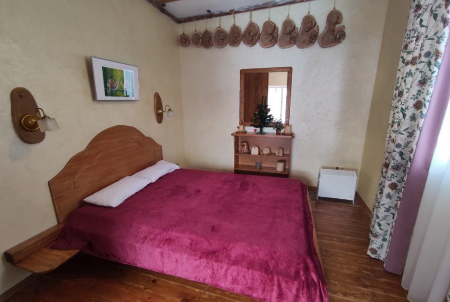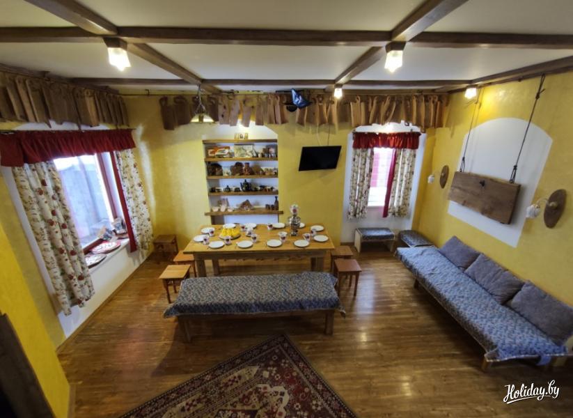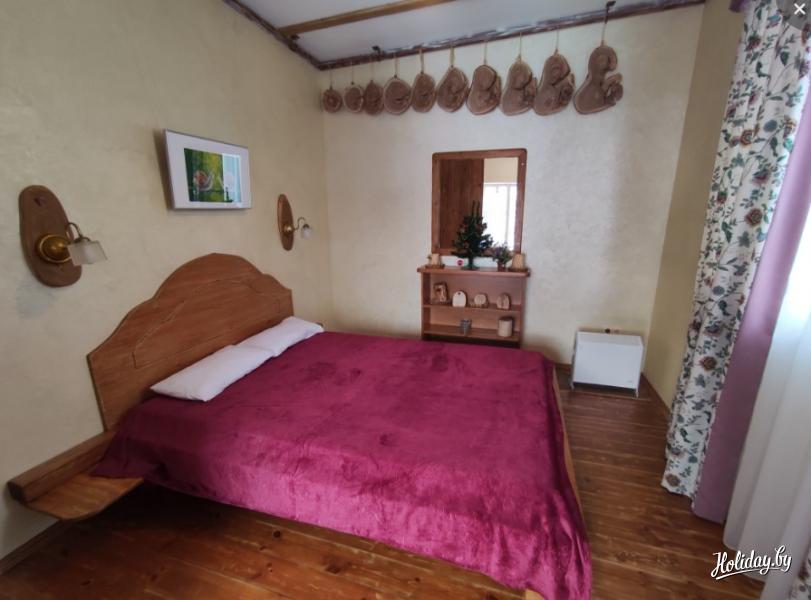 На территории усадьбы расположен просторный двухэтажный дом с оригинальным дизайном, прекрасным камином. К услугам гостей 5 комнат с мебелью из натурального дерева, белоснежное постельное белье, красивая посуда, русская баня на дровах с банными принадлежностями и травяным чаем собственного сбора.