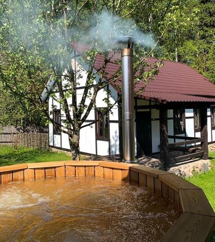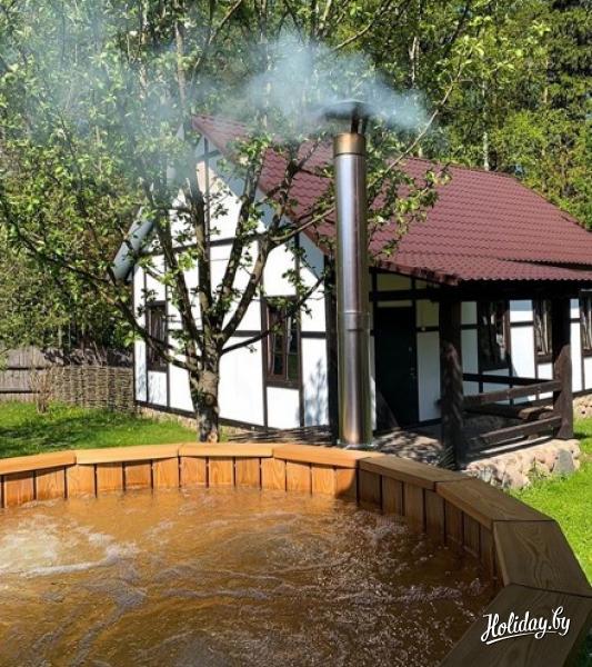 Агроусадьба с большой русской баней на 10 человек, есть джакузи на дровах и с подсветкой под открытым небом, банкетным залом на 30 человек, живописной беседкой на 10 человек с камином-мангалом для приготовления шашлыка и печью для приготовления другой пищи, спорт.площадкой (турники, канат) для любителей физкультуры с возможностью проведения занятий с профессиональным тренером; вокруг лес для пеших и лесных велопрогулок; банкетный зал оборудован караоке, большим телевизором и отдельной кухней; есть интернет; пока без спальных мест