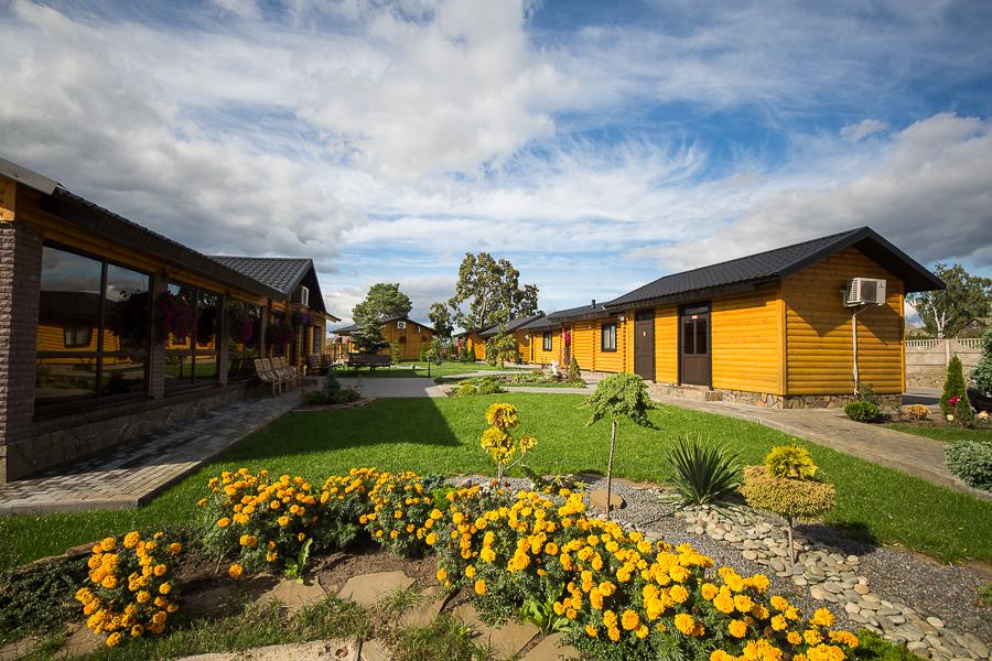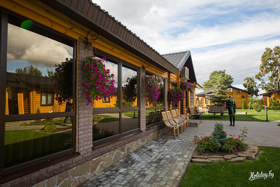 Территория усадьбы ― это аккуратный, чистый, озелененный мини-городок. Деревянные домики, беседки, мангалы для шашлыка, оборудованные детские площадки и качели, ровный газон, невысокие туи по периметру, дорожки ― все, чтобы гости чувствовали себя как дома. А для полного ощущения уединения, усадьба огорожена деревянным забором.
