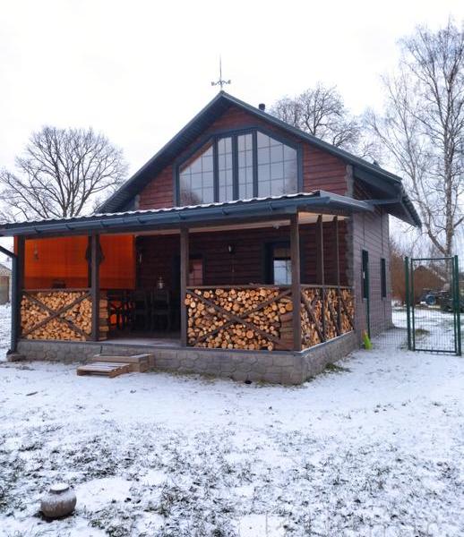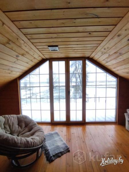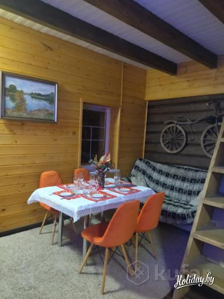 Площадь 60 м2 на участке 5 соток ограждённым забором. Размещение до 6 человек включительно. На первом этаже одна комната, типа студии с уютным раскладным диваном, столом для застолий. На втором этаже (удобная пологая лестница) 2-х спальная большая кровать и раздвижной 2-х спальный диван, панорамное окно, выходящее на природу, обеспечивает хорошее настроение жильцов, ощущение легкости и полета.
