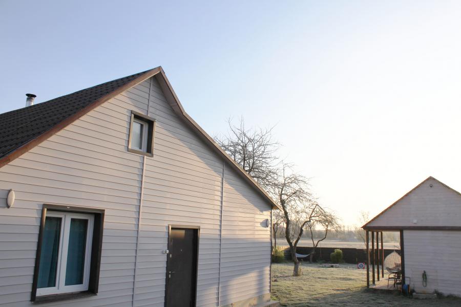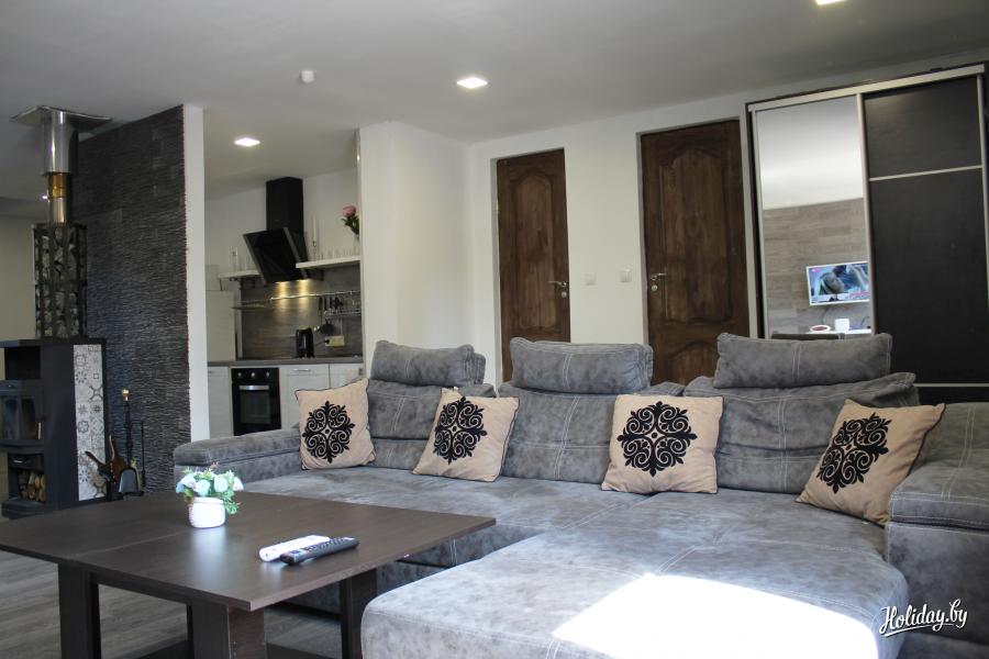 Дом расположен на участке 10 соток с высоким забором по всему периметру. На участке растут вишни, малина, смородина, ирга, клубника. Интерьер дома выполнен в современном стиле. Идеально подходит для отдыха всей семьей и компанией. Размещение до 8 человек. Состоит из: зала с камином, телевизором и диваном-кроватью с кухней, оснащенной современной техникой, и обеденной зоной; комнаты с двуспальной кроватью;
