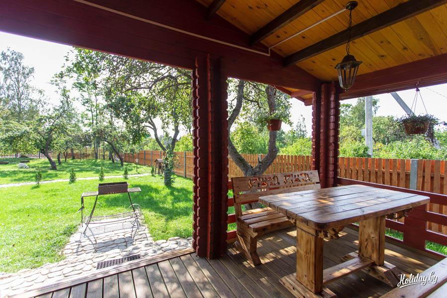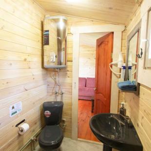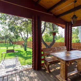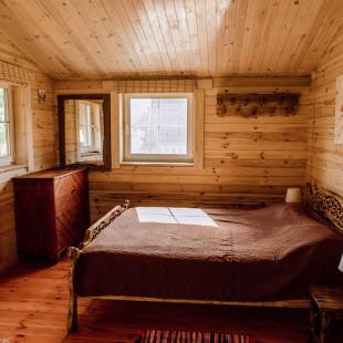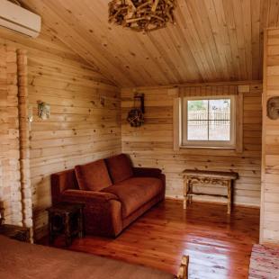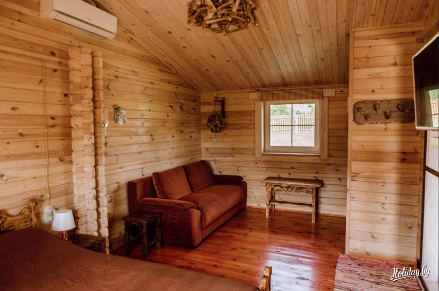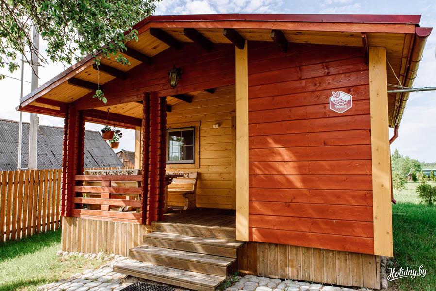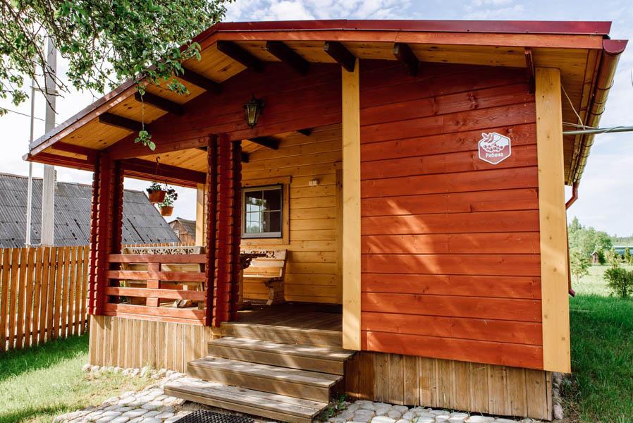 «Рябина» - деревянный дом с совмещенной спальней и гостиной. Удобная двуспальняя кровать ручной работы, диван, комод для вещей, также дом оборудован всей необходимой техникой: кондиционер, радиатор, телевизор, мини-холодильник, чайник. К вашим услугам зона барбекю с террасой и мангалом прямо у дома.