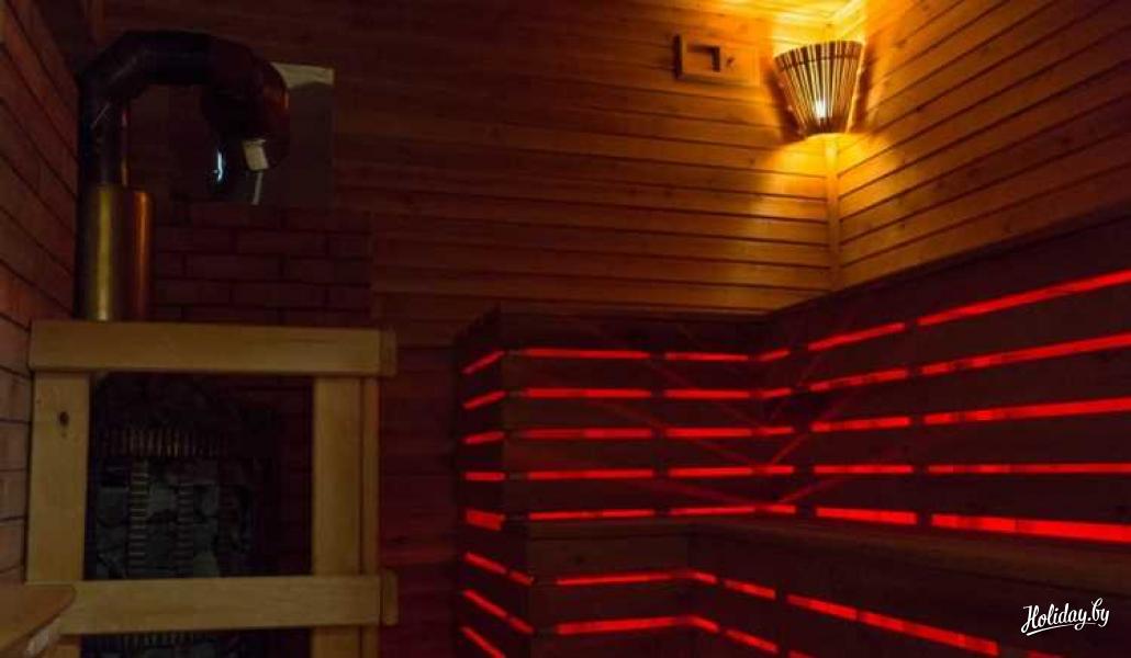 Баня представляет собой небольшой домик с парилкой, комнатой отдыха и мини-кухней. Кроме того здесь имеется спальня и санузел с душевой.