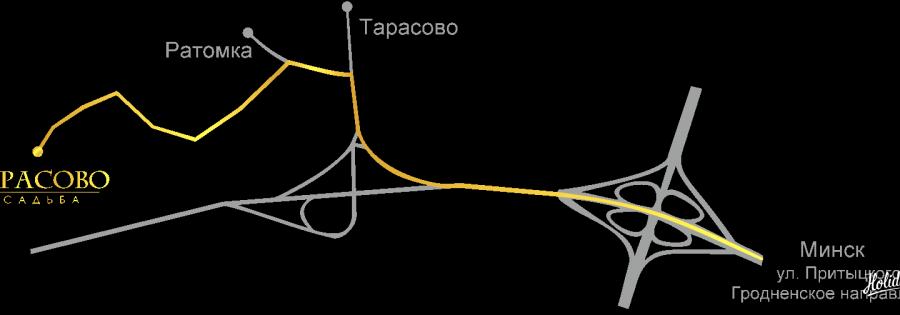800 м от МКАД (по ул. Притыцкого) поворот направо на Тарасово/Ратомку (указатель), через 350 м - налево по главной дороге на Ратомку, еще через 400 м - опять налево, дальше по зигзагообразной дороге (400 м) до усадьбы.