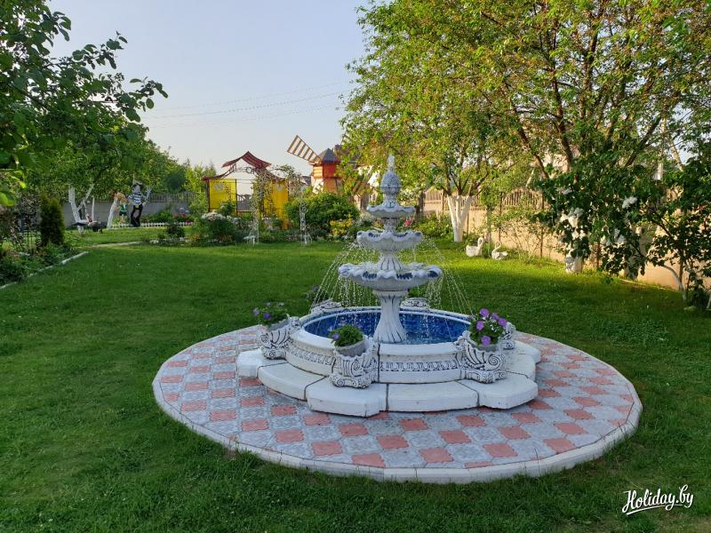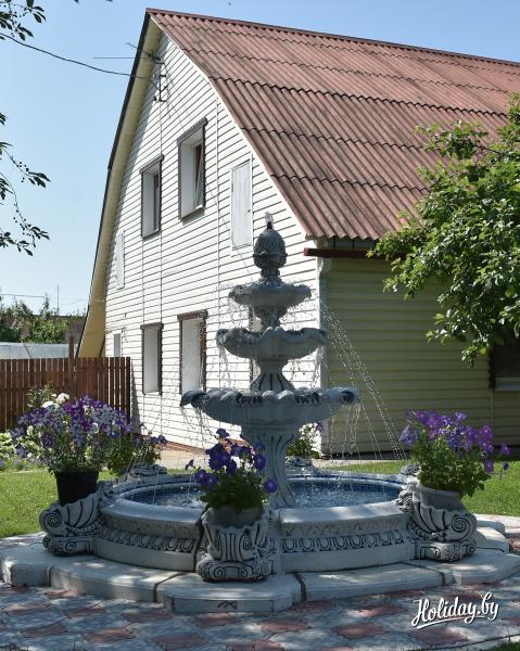 На территории коттеджа под Минском есть большая крытая терраса, способная комфортно вместить до 45 человек, где вы сможете организовать как спокойный отдых, так и отметить большой праздник. Детям очень понравятся качели, которые находятся прямо на крытой террасе. Гости по достоинству оценят имеющийся здесь мангал и смогут проявить свои кулинарные таланты. Привести в порядок тело и дух поможет баня на дровах с уютной гостевой комнатой отдыха. В сильный зной можно охладиться около пруда с фонтаном или уединиться в стильной беседке.