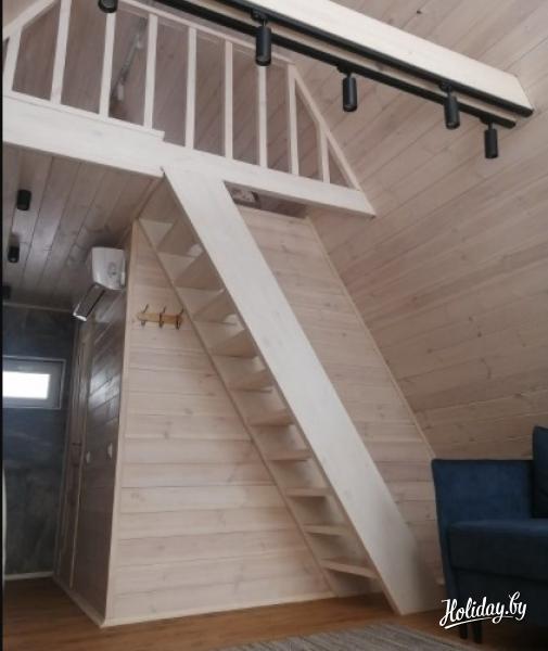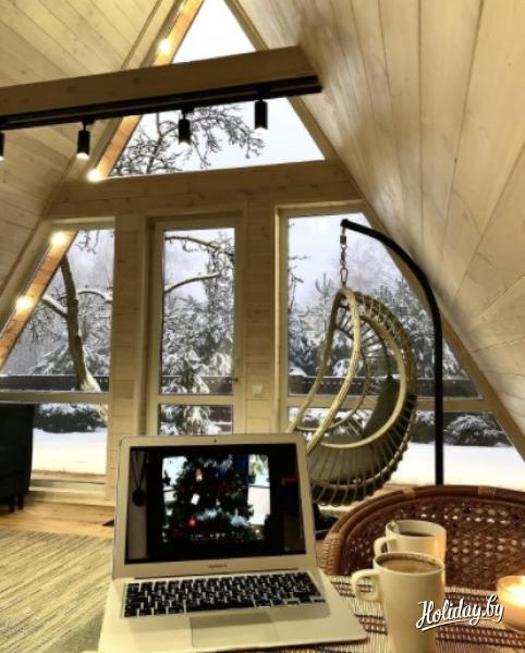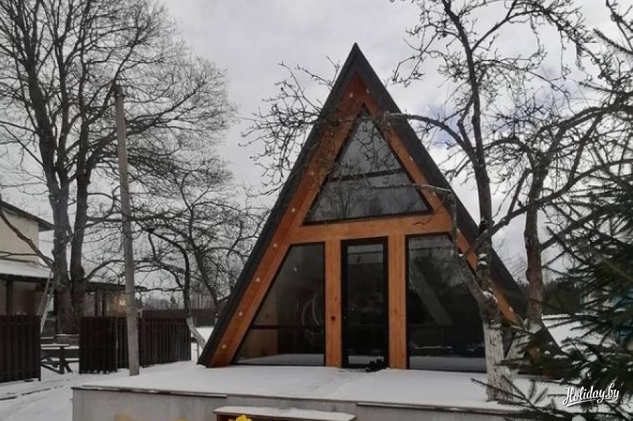 Треугольный дом шалаш расположен в 5 км от Заславля, ориентировочно в 25 минутах езды от Минска. К услугам гостей необычный домик, идеально подходящий для проживания пары. Здесь есть электрическая плита, кондиционер, холодильник, кастрюля, сковорода, микроволновка, тарелки, вилки, кружки, ложки, нож. Для ночевки предусмотрена двуспальная кровать и двуспальный диван-кровать.