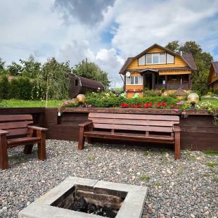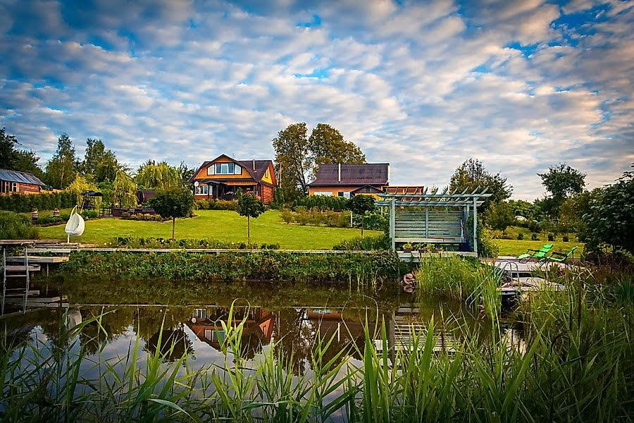 Территория и развлечения. Вокруг дома и хижины территория оформленная ландшафтным дизайнером. На ней располагается костровая зона и мангал, тихая беседка около небольшого водопада, детская площадка с песочницей, а у большого и глубокого пруда - зона для загара с шезлонгами. Длинный деревянный настил приведет Вас к пристани. К вашим услугам баня-бочка, вы можете приготовить блюда в тандыре, посетить пчелиную пасеку в компании гида, приготовить традиционный литовский десерт Шакотис на специальном оборудовании, прокатиться по большому озеру на лодке с мотором. И не забудьте попробовать нашу фирменную пиццу из дровяной печи!