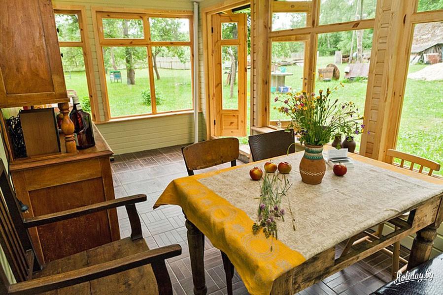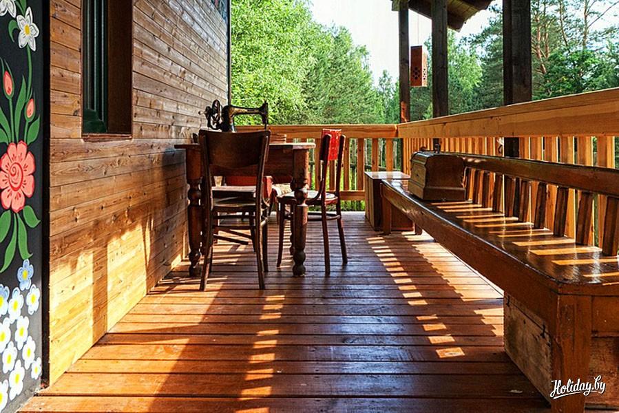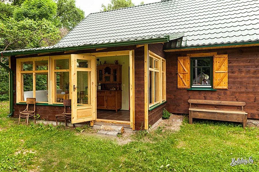 Дом для гостей – это отдельное двухэтажное здание с двумя спальнями, гостиной и белорусской баней. В доме есть горячая и холодная вода. На первом этаже расположена большая открытая терраса, а на втором этаже – балкон.