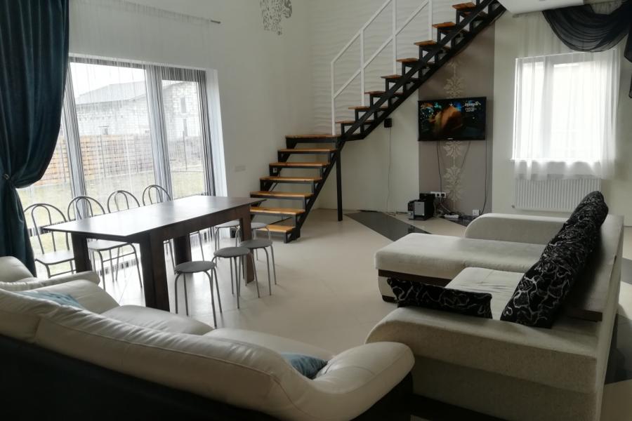 Коттедж "В современном стиле" подойдет для отдыха компаний до 16 человек, с ночевкой смогут расположиться до 10 человек. В двухуровневом коттедже оборудованы теплые полы, работает Wi-Fi. На первом этаже расположена просторная гостиная с витражными окнами, спальня, санузел, кухня, оборудованная необходимой техникой. На втором этаже имеется три спальных комнаты.