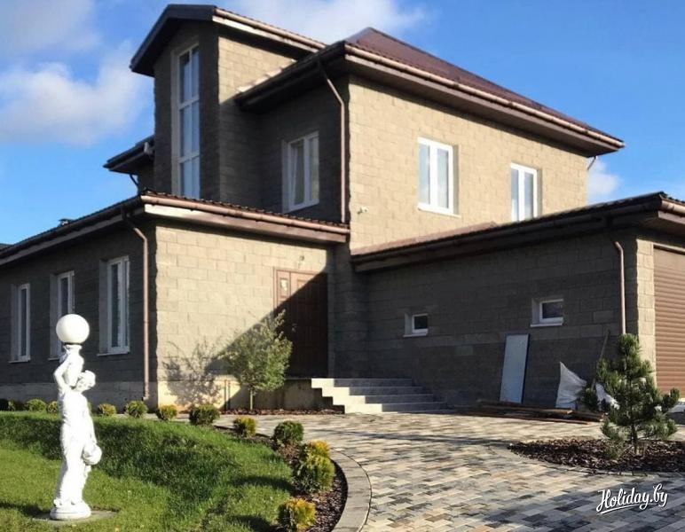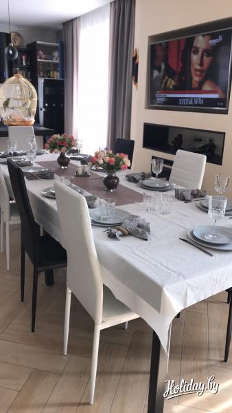 Для проживания предлагается разместиться в большом (основном) трёхэтажном гостевом доме. Современный дом обставлен стильной мебелью, над интерьером с любовью потрудились дизайнеры – везде светло и уютно. Коттедж на сутки вмещает на ночлег до 15 гостей. Дом в аренду под Минском оборудован всеми необходимыми удобствами, в том числе на каждом этаже есть ванная комната с санузлом, кухня с бытовой техникой, спутниковое телевидение, интернет. На третьем этаже дома установлен настольный футбол.