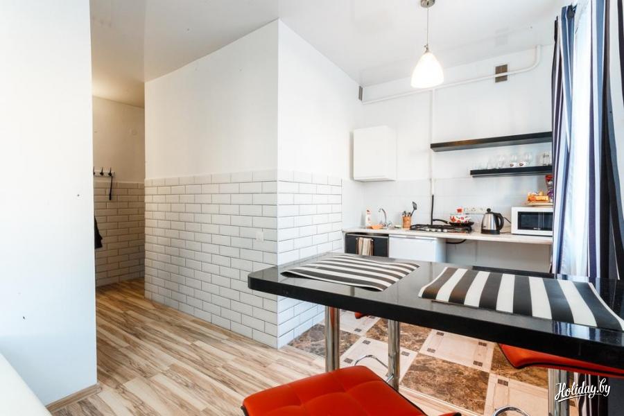 Мини-кухня оборудована духовкой, микроволновой печью, холодильником, плитой и чайником. При аренде квартиры вам предоставят тапочки и постельное белье.