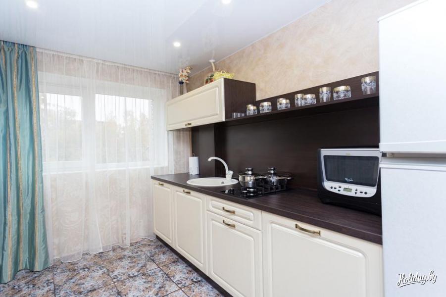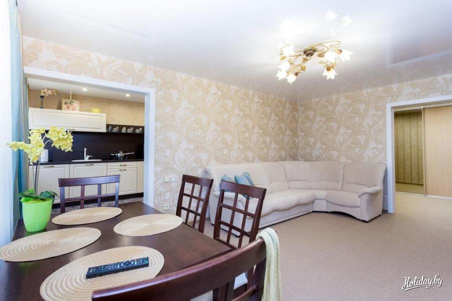 Апартаменты на Хоружей в Советском районе Минска. Квартира подойдет для комфортного проживания компании из 5 гостей. Для ночевки предусмотрены 2 спальные комнаты и гостиная. Гости смогут разместиться на одной из трех двуспальных кроватей или на раскладывающемся диване.