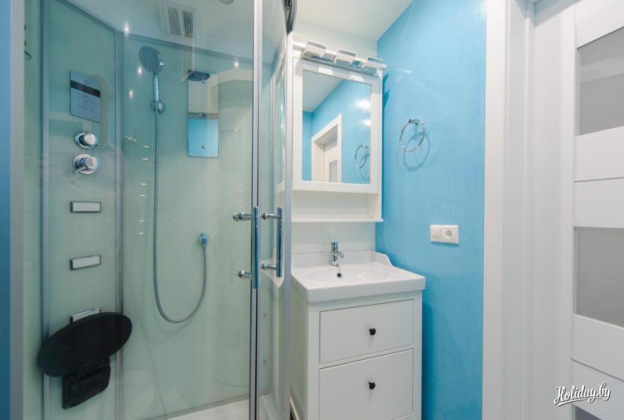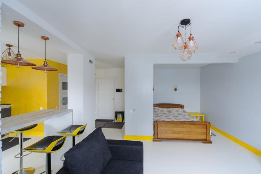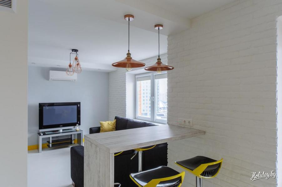 В квартире есть кровать и раскладывающийся диван для комфортной ночевки. Кухня оборудована необходимой техникой: плитой, чайником, холодильником, микроволновой печью и посудомоечной машиной.