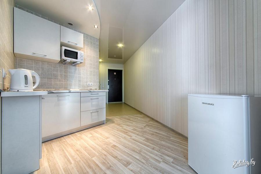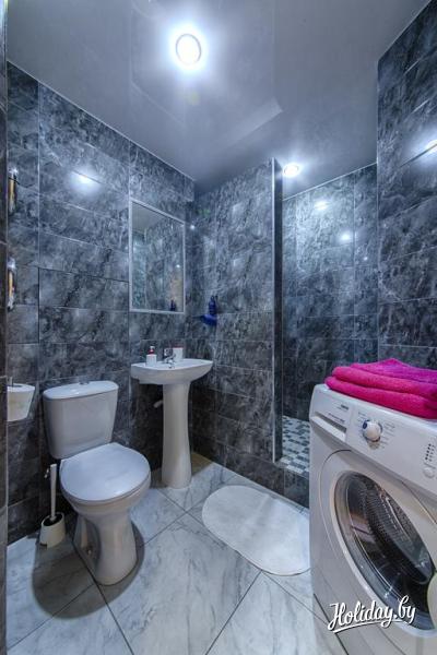 Кухня оборудована всей необходимой техникой: холодильник, чайник, плита. Ванная комната оснащена стиральной машиной, феном, а также туалетно-косметическими принадлежностями.