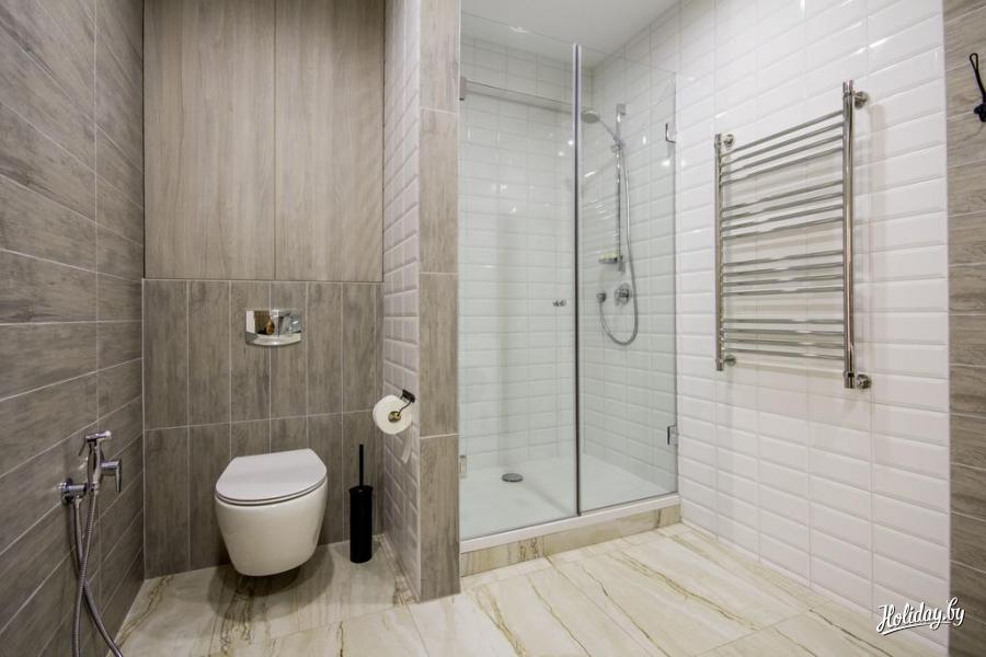Ванная комната оборудована душевой кабиной и стиральной машиной.