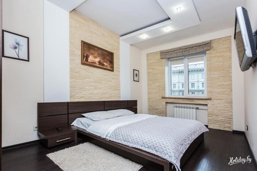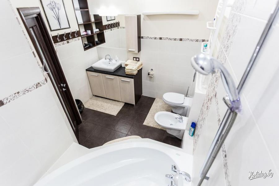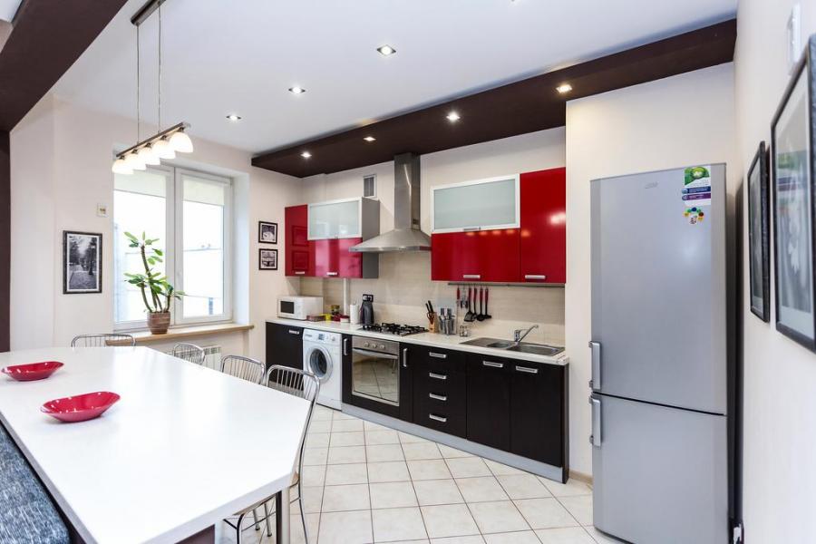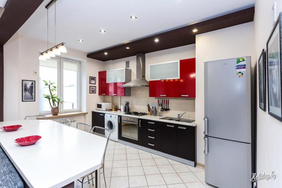 Спальные места в апартаментах: двуспальная кровать и двуспальный диван-кровать. Кухня оборудована необходимой техникой и посудой, а также стиральной посудой.