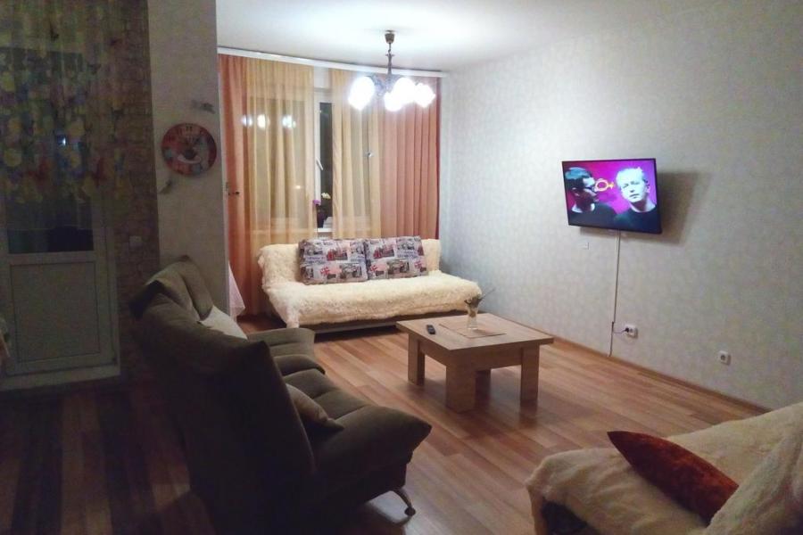 Апартаменты на Неманской в Фрунзенском районе подойдут для проживания больших компаний до 12 человек. В просторных апартаментах располагаются 2 спальные комнаты, гостиная, кухня, ванная комната. Спальные места представлены односпальной кроватью, двумя двуспальными кроватями и четырьмя диванами-кроватями.