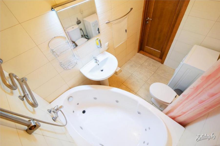 Кухня апартаментов оснащена необходимой техникой: плитой, холодильником, чайником. В ванной комнате есть ванная, стиральная машина. Гостям предоставляется полотенца и постельное белье.