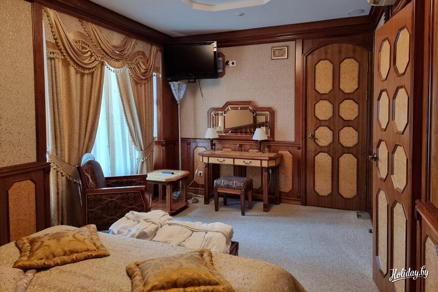 Любопытный Holiday.by прогулялся по номерам и коридорам исторического наследия Беларуси В каждом из них есть удобная двуспальная кровать, диван либо кресло, рабочий стол с тумбой, шкаф, багажница. Ванные комнаты оборудованы исключительно новейшей современной сантехникой, в каждом номере класса «люкс» - джакузи. Кроме того, в номерах работает система климат-контроля, оборудованы теплые полы ,работает спутниковое телевиденье, находится индивидуальный сейф, а также в распоряжении гостей междугородняя и международная телефонная связь и Wi-Fi.